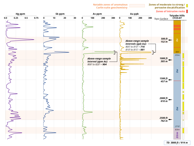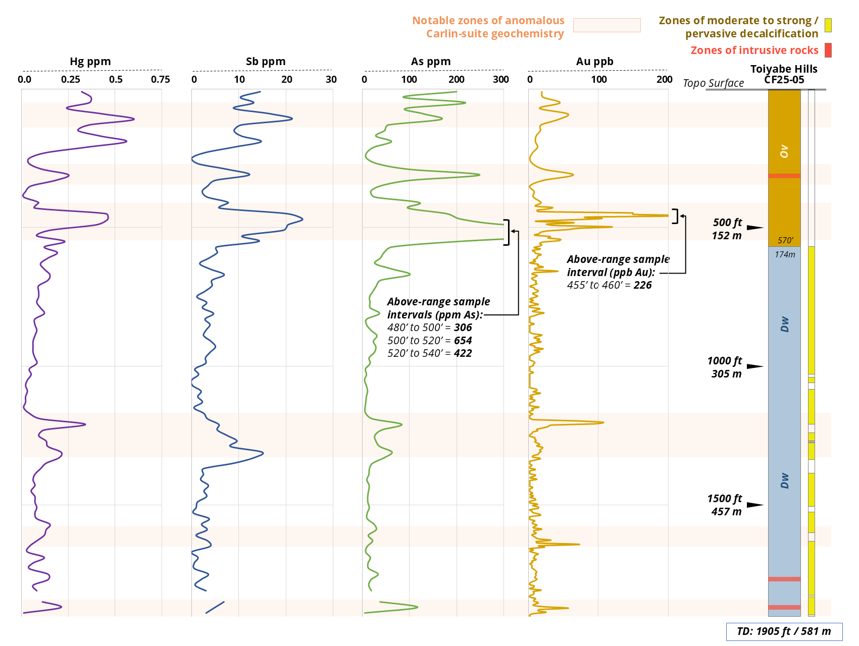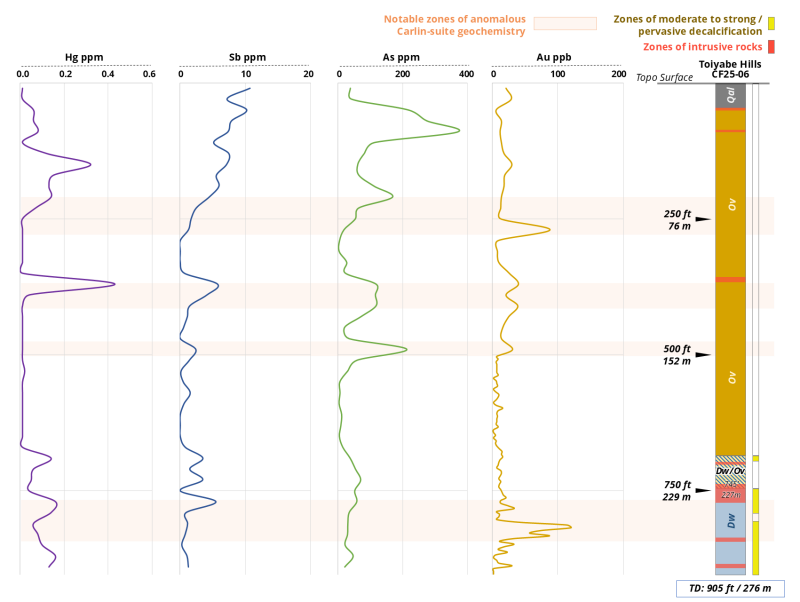 • CF25-05 encountered an 80-metre-thick interval near the bottom of the hole characterized by pervasive decalcification, quartz veining and/or selvages of silicification, shearing (blind thrust with graphitic, elliptical chips), multiple sulfidized dikes, and increased amounts of sooty sulfides including quartz-sooty pyrite stringers to stockworks. This hole also returned elevated gold, arsenic, antimony and mercury around the Roberts Mountains Thrust (4.6m of 0.17 g Au/t).