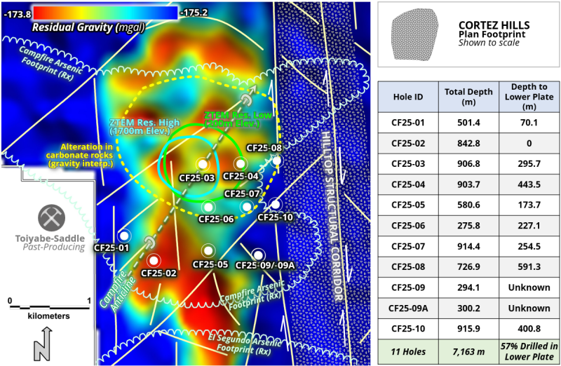Colin Moore, President & CEO, noted: “I’d like to take this opportunity to thank everyone who helped make this ambitious inaugural drilling campaign at Campfire a success – no small feat for a company of our size. With the financial support of our shareholders and expert execution from our technical team and contractors, we were able to complete an expanded program in a safe, timely, and cost-effective manner. This initial Phase I program has demonstrated the outsized scale potential of this target area; with every hole the system footprint is growing, and we have yet to find the limits of it. We continue to intersect elevated Carlin-type gold along with pathfinder trace elements in the expected settings, namely near the Roberts Mountains Thrust and in the Wenban Formation. This is an ideal set-up for a Phase II program, where we can begin to target the more concentrated mineralized zones that turn discoveries into economic deposits. Along with the remaining pending assays from Campfire, over the coming weeks and months we will be providing details from additional exploration activities that will further enhance our technical understanding of the Property moving into 2026.”