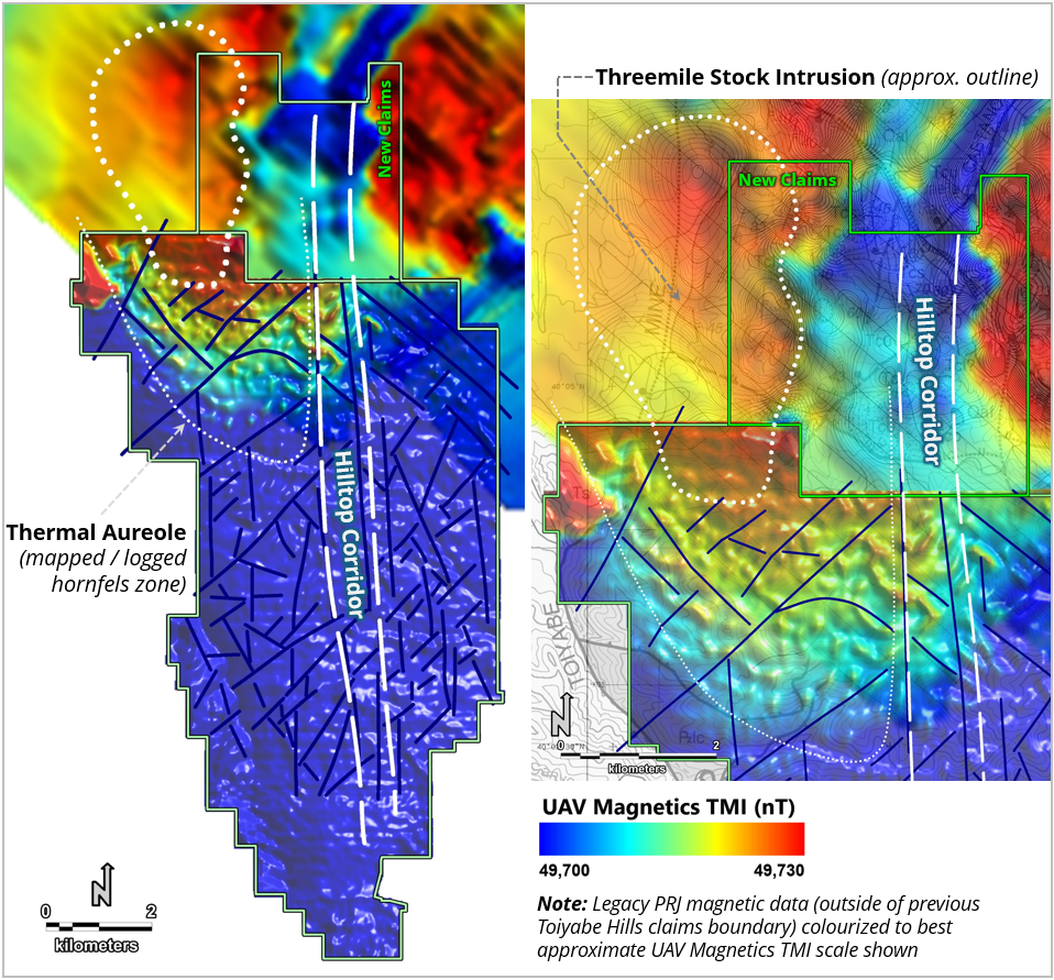 At the end of the 2025 field season, MWH Geo-Surveys International Inc. of Reno, NV (“MWH” ) completed a Property-wide drone magnetic survey, flown at 50-metre line spacings and an average altitude of 48 metres. The data acquired were then processed and analyzed by Mr. Jim Wright of J.L. Wright Geophysics in Spring Creek, NV, a renowned geophysicist with over 40 years of expertise within the Carlin and Cortez Districts of northern Nevada. The major findings included an interpreted deep-seated igneous stock near the northern boundary of Toiyabe Hills, intruded into the footwall of the Hilltop Corridor. Observations consistent with a thermal aureole – evidently, the peripheral effects of the Threemile Stock – had previously been made by the Company at the Property, with hornfels alteration mapped at surface and logged in nearby drill holes. Figure 1 below shows total magnetic intensity (TMI) and combines 2025 MWH magnetic data with inherited legacy data collected via fixed-wing surveys in the 1980s and 1990s by Pearson, deRidder and Johnson (“PRJ ”) of Lakewood, CO. A step-out drone magnetic survey by MWH – to be completed imminently – will improve upon the legacy PRJ data to the north and more precisely define the dimensions and character of the Threemile Stock.