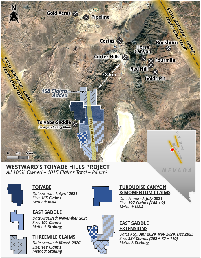Vancouver, British Columbia, March 26, 2026 – TheNewswire – Westward Gold Inc. (CSE: WG, OTCQB: WGLIF, FSE: IM50) (“Westward” or the “Company” ) is pleased to announce the discovery of a deep-seated igneous stock, as indicated by a magnetic survey, near the former northern boundary of its Toiyabe Hills Property in Lander County, Nevada (“Toiyabe Hills” , or the “Property” ). This new revelation marks a significant development in the understanding of the Property, and the Company has since expanded its land position northwards to cover additional ground over and adjacent to the concealed magnetic intrusion (the “Threemile Stock” ), which is situated at depth in the footwall of a district-scale north-south structural corridor and mineralization control (the “Hilltop Corridor” ). The recently-interpreted magnetic data also highlighted major dike swarms that vector towards the Threemile Stock, which explains their presence and suggests the igneous features are connected at depth. Deep-seated magnetic intrusions of this character, in close association with felsic to lamprophyric dike swarms, form an igneous centre. This unique structural setting is a key component of the largest Carlin-style gold camps in Nevada, including the Goldstrike, Pipeline and Cortez Complexes. Additional work is planned over the coming weeks and months to more precisely define the geometry and characteristics of the Threemile Stock.