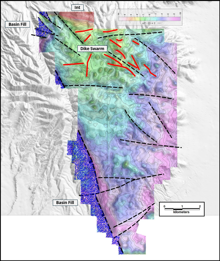 Property-wide drone magnetic survey flown at the end of 2025 indicates a buried intrusive centre near the previous northern boundary of Toiyabe Hills