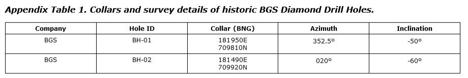 The company was granted partial access to approximately 31 m of historic core from the BGS archives. Reassay of the limited sample set revealed a moderate correlation between new and historic assay results for copper and the presence of sporadic gold, although the results are not conclusive.
