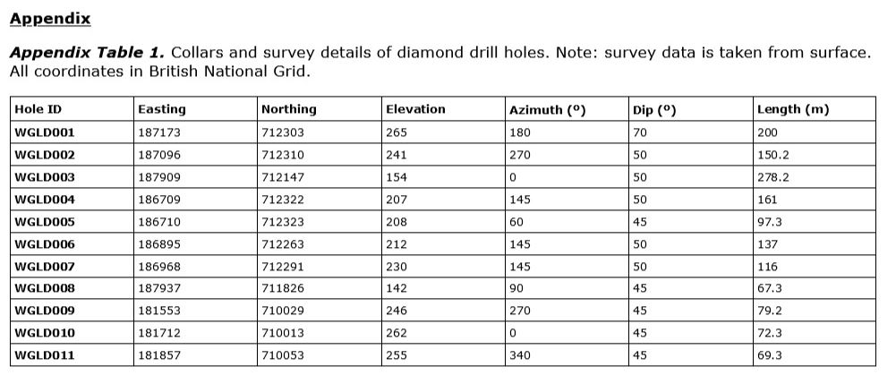 Gold Bearing Porphyry Breccia [Hole WGLD009, Ardlochan] Initial 79m hole intercepted 47.4m @ 0.38g/t Au, from 31.8m downhole.Including 4.2m @ 1.2 g/t Au from 31.8m and 2m @ 1.25 g/t Au from 71m downhole within a porphyry breccia unit. Gold mineralisation remains open at depth.