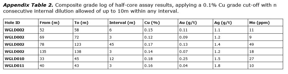 WGLD002 is a shallow hole targeting extensions to the copper-gold bearing stockwork mineralisation at North Hill. Low grade stockwork mineralisation was successfully intercepted throughout the hole and is hosted by a feldspar plus or minus biotite porphyry with local brecciation, similar to that observed at North Hill. This intercept extends the scale of porphyry mineralisation c. 800m west of North Hill - linking these two areas is a target of future drilling (see Figure 2). Mineralisation up to 0.54% Cu and 0.26 g/t Au over 1m (from 79m) indicate that higher grade stockwork exists within the system.