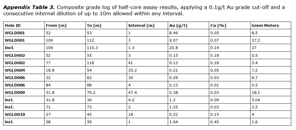 Skarn Mineralisation [Hole WGLD006-07, Lagalochan]Low grade gold skarn mineralisation intercepted in multiple holes with a best intercept of 3m @ 1 g/t Au, 0.05% Cu from 44m within a larger interval of 30m @ 0.29 g/t Au from 30m downhole.Higher-grade skarn surface targets remain untested. Proof of concept that skarn mineralisation is a valid exploration target adding to the economic potential of the project.