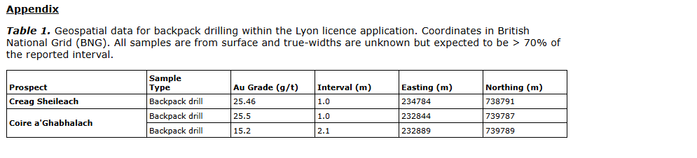 - 1.0 m at 25.5 g/t Au and 2.1 m at 15.3 g/t Au, from surface (Coire a'Ghabhalach prospect);