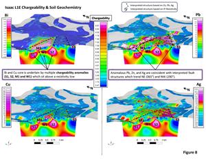 - At Isaac, four 1st priority, three 2nd priority and one 3rd priority chargeability anomalies were identified, with target depths ranging from 50 to 550 m. The bismuth and copper core of the soil anomaly is underlain by multiple chargeability anomalies (S1, S2, M1 and W1 on Line 1E) which sit above a resistivity low. Anomalous lead, zinc, and silver, which form a halo around the core, are coincident with fault structures on the south side and north side of the survey area which trend NE (065°) and NW (290°) respectively.