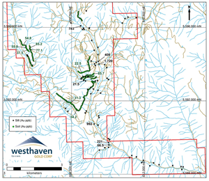 In April 2023, Westhaven completed a sampling program, collecting 210 soils, 136 stream silts and 103 rocks. Soil and silt sampling targeted previously unsampled areas and specific areas of interest identified from past programs. Rock samples were collected during the geochemical work but do not represent a focused prospecting program, though veining and alteration were encountered. Stream silt sampling was the primary focus of this program as we collected and analyzed 5 size fractions at each sample site. The highest gold values received to date include 1,720 ppb Au and 992 ppb Au coarse size fraction analysis.