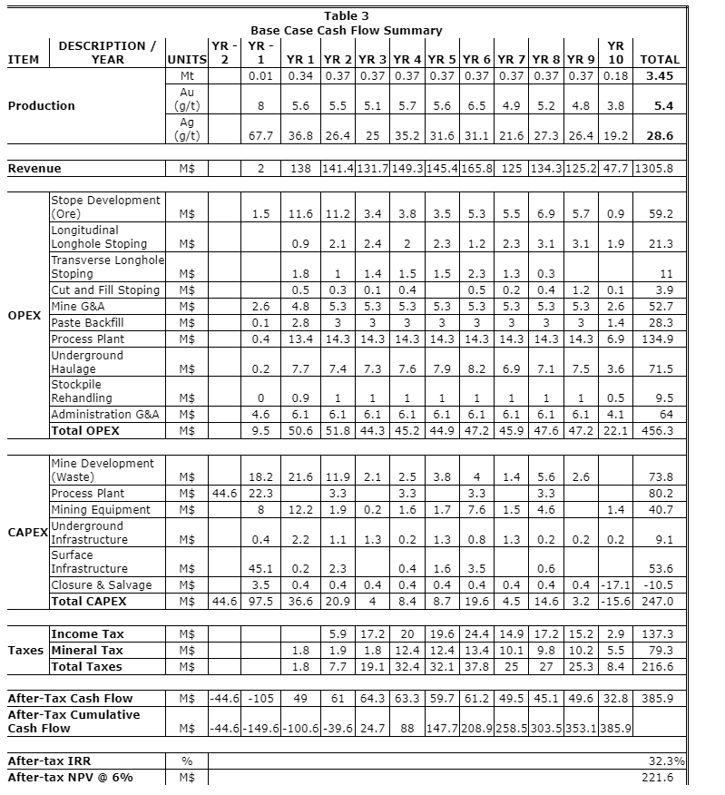 The PEA outlines a production mine life of 9.5 years with average annual production of 56,100 ounces gold and 284,200 ounces silver at average cash costs and all-in sustaining costs (AISC) per ounce gold equivalent of $752 (U.S.). The PEA considers the payable recovery of 534,200 oz gold and 2,715,200 oz silver from an underground operation, at average mine production grades of 5.37 g/t and 28.62 g/t, respectively.