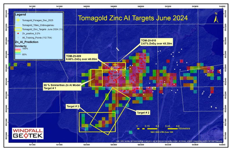 Brossard, Québec - TheNewswire - December 22, 2025 — Windfall Geotek Inc. (CSE: WIN; OTCQB: WINKF) ("Windfall" or the "Company"), a pioneer in Artificial Intelligence (AI) - driven mineral exploration since 2005, is pleased to announce the identification of 11 high-priority zinc targets within the Chibougamau mining camp region of Québec for Tomagold (TSXV: LOT; OTCPK: TOGOF)