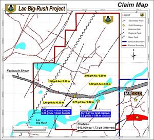 Figure 1. Map of Precore’s Lac Big-Rush property including location of historical showings.