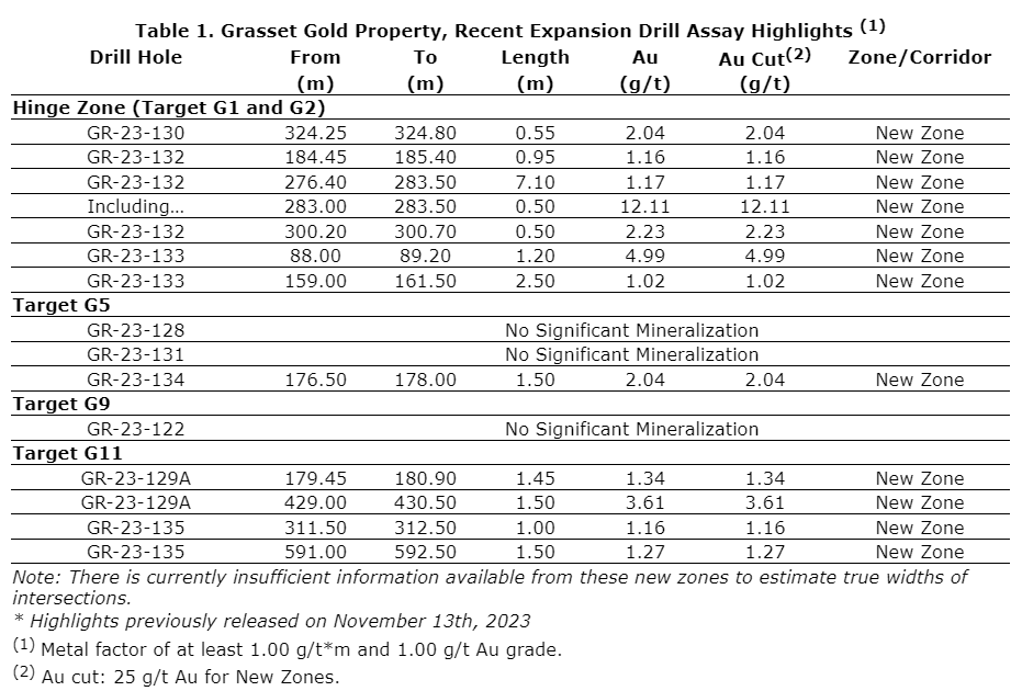 - New assays received from the 2023 drill program expanded upon the gold mineralization previously reported within the Hinge zone (targets G1 and G2), with intervals including 12.11 grams per tonne (g/t) gold (Au) over 0.50 metre and 4.99 g/t Au over 1.20 metres.