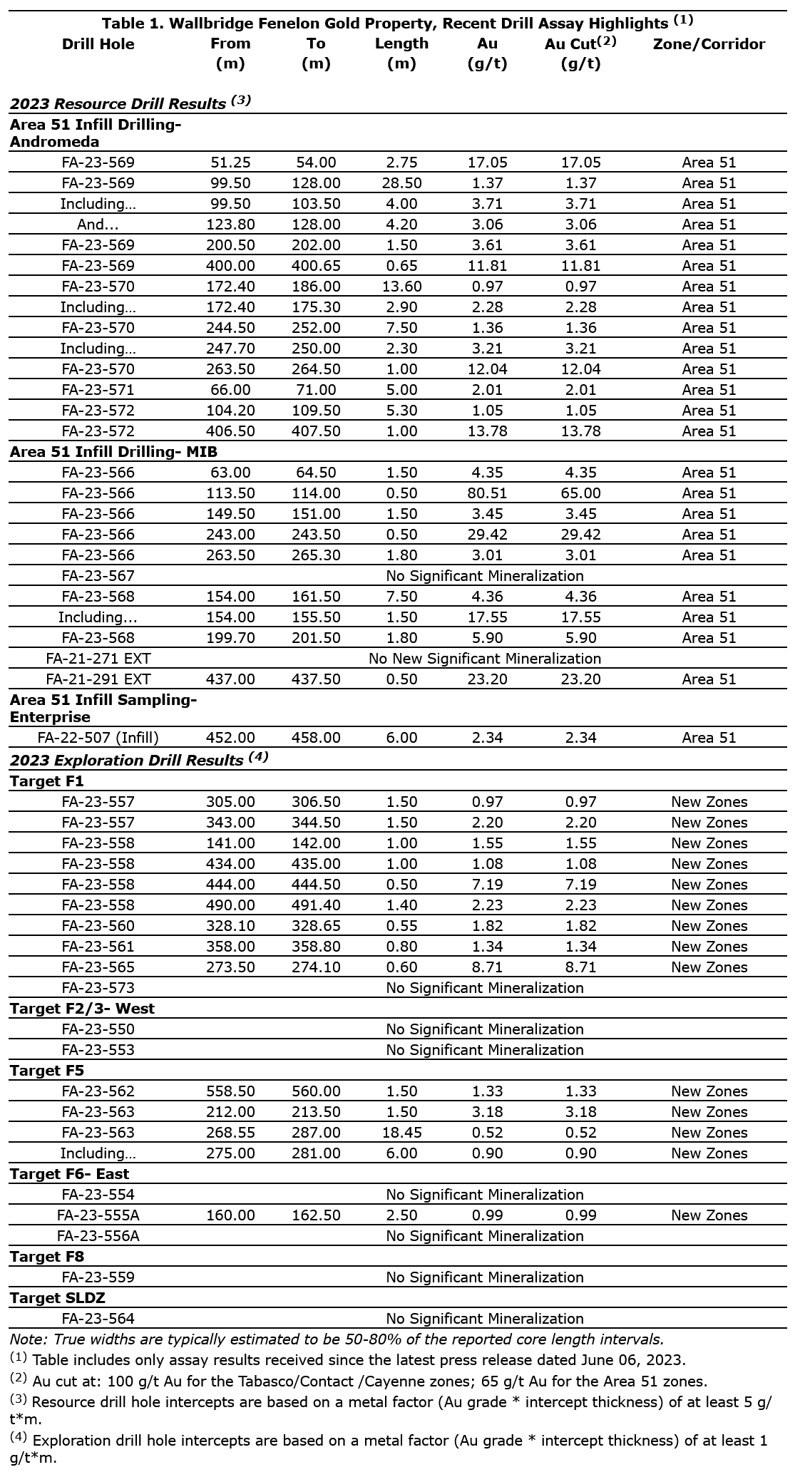 Results, such as 17.05 g/t Au over 2.75 m in hole FA-23-569, 80.51 g/t Au over 0.50 m in hole FA-23-566, and 4.36 g/t Au over 7.50 m in hole FA-23-568, demonstrate the potential to add near-surface, high-quality gold ounces proximal to the currently defined limits of the Fenelon resource.
