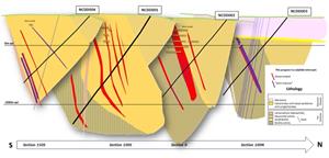 Figure 1: Nueva Celti stacked EW (looking North) cross sections containing the holes for the finalized first phase of drilling, including the position of the mine levels also shown.