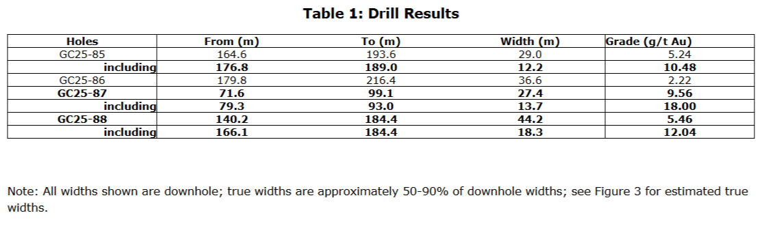 - Hole GC25-87 returned 27.4 metres of 9.56 grams per tonne gold at 71.6 m to 99.1 m, including 13.7 m of 18.00 g/t Au at 79.3 m to 93.0 m, about 50 m up dip from GC25-49 (62.5 m at 4.73 g/t Au) -- expanding the highest-grade part of the zone up dip.