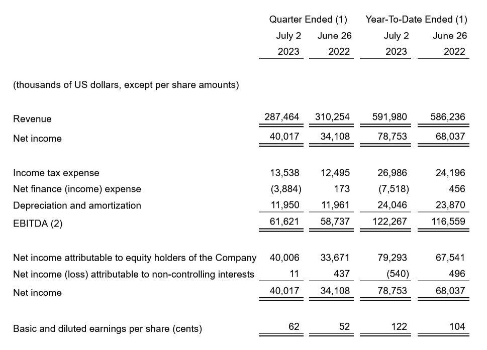 For the six months ended July 2, 2023, net income attributable to equity holders of the company amounted to $79.3-million, or 122 cents per share, an increase of 17.4 per cent compared with the 2022 first half result of $67.5-million, or 104 cents per share. Net finance income raised EPS by nine cents. Gross profit and foreign exchange were also influential with both items bolstering EPS by 4.5 cents. Income taxes and the level of net income attributable to non-controlling interests each benefitted EPS by 1.5 cents. Operating expenses had the opposite effect, dampening EPS by three cents.