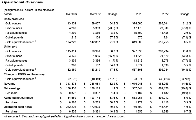 Revenue in the fourth quarter of 2023 was $313-million (74 per cent gold, 24 per cent silver, 1 per cent palladium and 1 per cent cobalt), with the $77-million increase relative to the prior-period quarter being primarily due to a 17-per-cent increase in the number of GEOs sold, and a 13-per-cent increase in the average realized gold equivalent price.