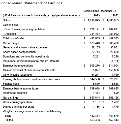 Revenue was $1,016-million in the year ended Dec. 31, 2023, representing a $49-million decrease from 2022 due primarily to a 10-per-cent decrease in the number of GEOs sold, resulting from relative changes in the GEOs produced but not yet delivered, partially offset by a 6-per-cent increase in the average realized gold equivalent price.