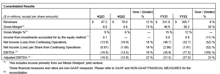 Revenue of $331.8-million for 2023 and $87.2-million for the fourth quarter. Full-year results were primarily driven by increased sales volumes in the delayed OEM (original equipment manufacturer), electronics and fuel storage businesses, as well as additional engineering service revenues from the heavy-duty OEM businesses. This growth is partially offset by the negative impact of the lower CNG (compressed natural gas) sales volumes to customers in the India market, lower independent after-market sales (IAM) volumes in Africa and lower sales volumes in the hydrogen business;