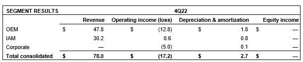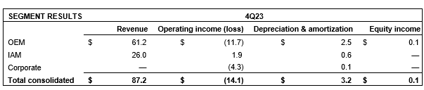 OEM revenue for the three months and year ended Dec. 31, 2023, was $61.2-million and $222.8-million, respectively, compared with $47.8-million and $198.0-million for the three months and year ended Dec. 31, 2022. The increase of $13.4-million as compared with the fourth quarter 2022 was primarily driven by higher sales volumes in the light-duty OEM and electronics businesses and higher engineering service revenue from the heavy-duty OEM business. This was partially offset by lower sales volumes in heavy-duty OEM, delayed OEM and fuel storage businesses compared with the prior year.