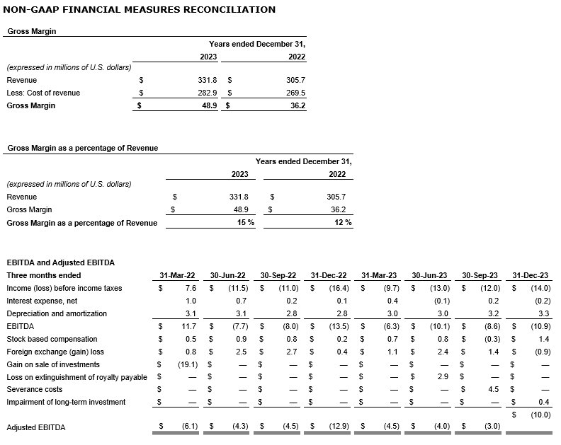 Gross margin for the three months ended Dec. 31, 2023, increased by $1.8-million to $7.2-million, or 28 per cent of revenue, compared with $5.4-million, or 18 per cent of revenue, for the same prior-year period, primarily driven by the positive sales mix, lower electronic component costs and increased volumes sales in Europe.