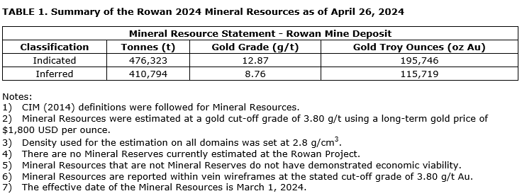 Shane Williams, president and chief executive officer, stated: "The 2024 Rowan MRE model represents a complete reinterpretation of the structural controls on mineralization and reflects a more conservative estimation approach in line with industry best practices. When drilling off structurally complex high-grade gold systems that contain significant amounts of coarse gold, it is essential to have a solid understanding of the geology and controls on mineralization early in the process. We are very encouraged to see a significant portion of higher-confidence indicated resources come from this MRE update and at grades 40 per cent higher than the 2022 MRE. The objective for this year at Rowan will be growth, and we continue to see significant potential for expanding this deposit at depth and along strike."
