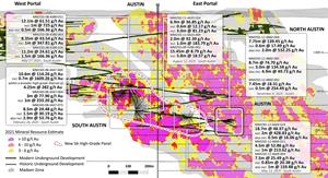 FIGURE 5. Long section highlighting top three intercepts from 2025 South Austin and Lower Austin drill stations. South Austin high-grade panel has been outlined in red and follows a plunge line that appears to extend into the Austin 904 Complex area.[1]