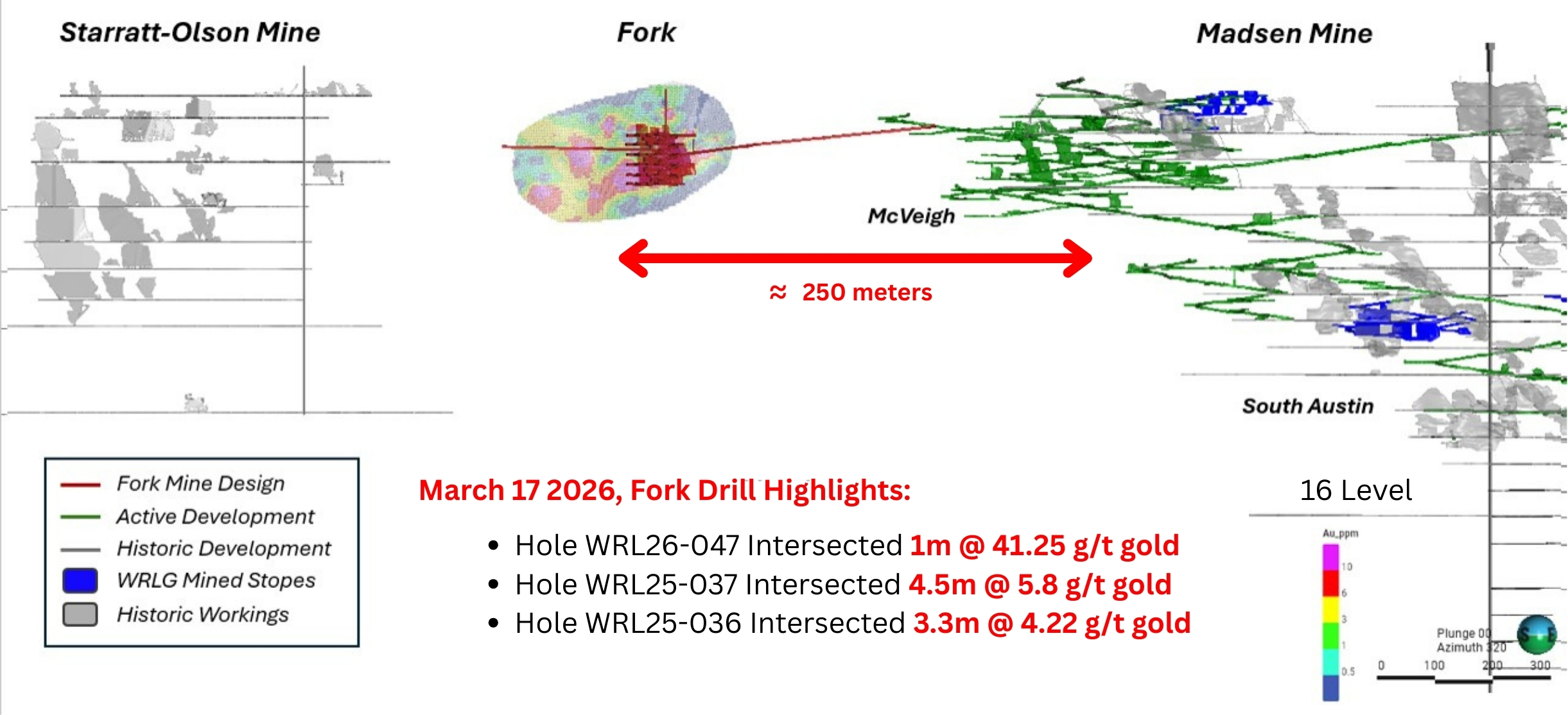 The extension of underground development towards Fork will also open significant exploration potential and underground drilling opportunities along the main structural trend from Madsen towards the past-producing Starratt-Olson Mine, which historically produced ~164,000 ounces of gold between 1948-1956.