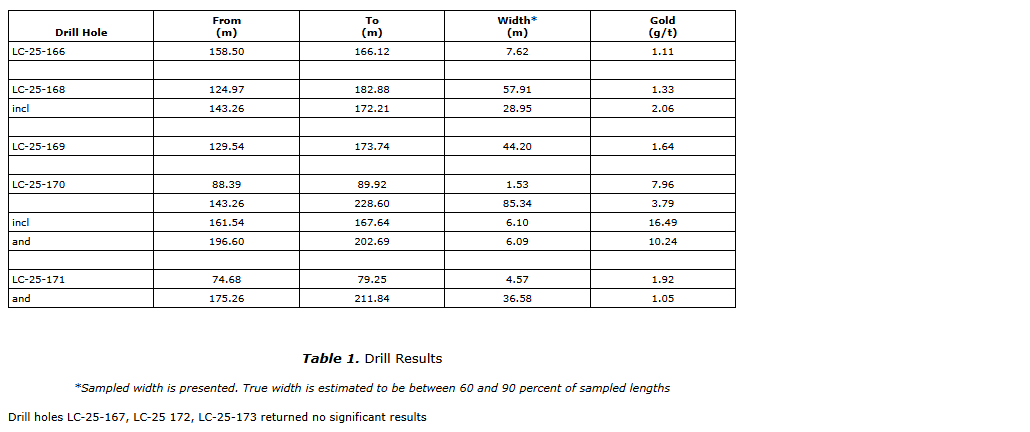 • Drill hole LC-25-171 returning 1.92 g/t Au over 4.57 metres starting at 74.68 metres and 1.05 g/t Au over 36.58 metres starting at 175.26 metres.