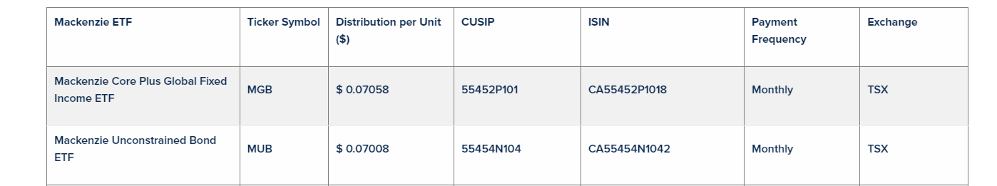 Mackenzie Investments has declared the June, 2023, monthly cash distributions for its exchange-traded funds listed in an attached table that trade on the Toronto Stock Exchange and Cboe Canada. Unitholders of record on July 5, 2023, will receive cash distributions on July 12, 2023.