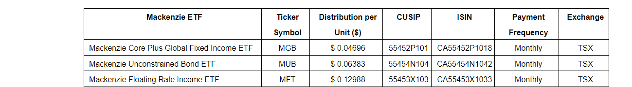 Mackenzie Investments has declared the February, 2024, monthly cash distributions for its exchange-traded funds listed in an attached table that trade on the Toronto Stock Exchange and Cboe Canada. Unitholders of record on March 4, 2024, will receive cash distributions on March 11, 2024.