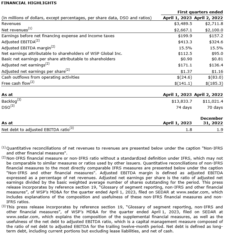 WSP Global Inc. has released financial and operating results for the first quarter ended on April 1, 2023.