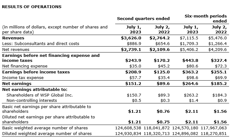 WSP Global Inc. has released financial and operating results for the second quarter ended on July 1, 2023.