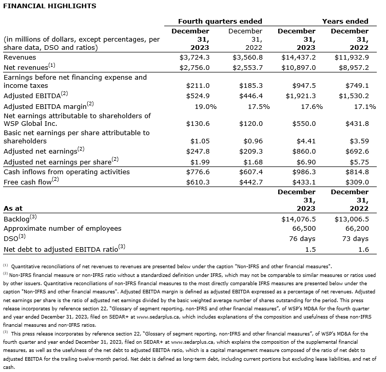 WSP Global Inc. has released financial and operating results for the fourth quarter and year ended Dec. 31, 2023.