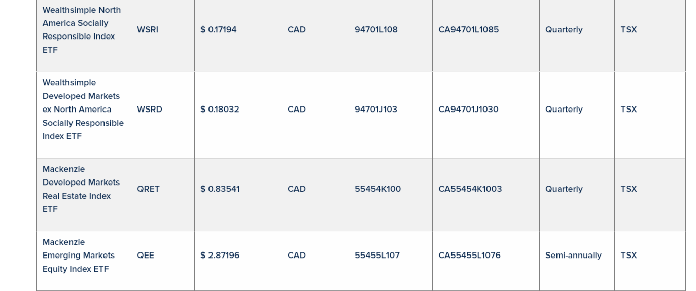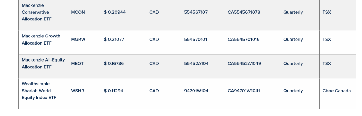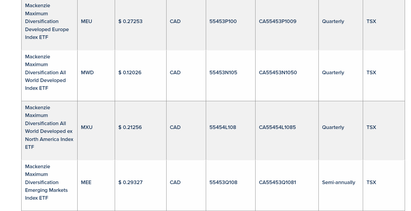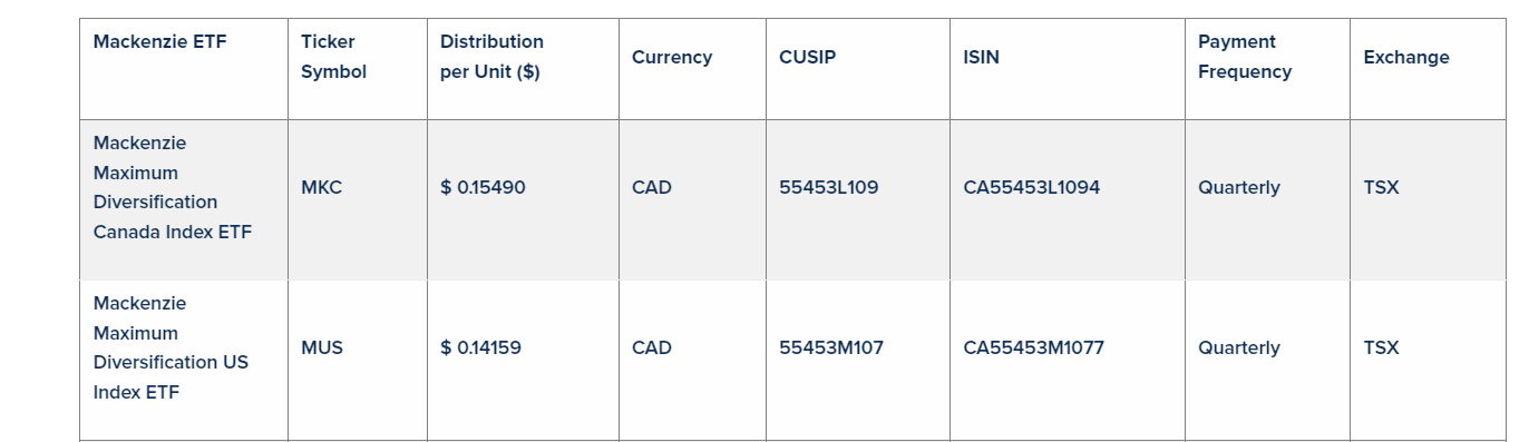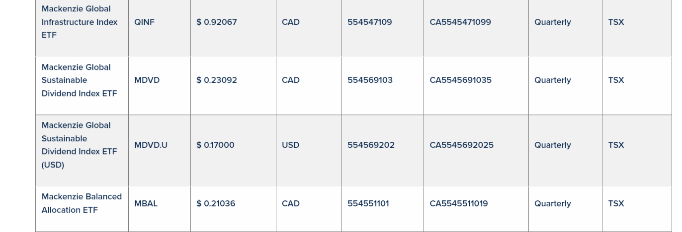 Mackenzie Investments has declared the December, 2023, quarterly cash distributions for its equity exchange-traded funds (ETFs) listed in an attached table that trade on the Toronto Stock Exchange and Cboe Canada. Unitholders of record on Dec. 19, 2023, will receive cash distributions on Dec. 28, 2023.