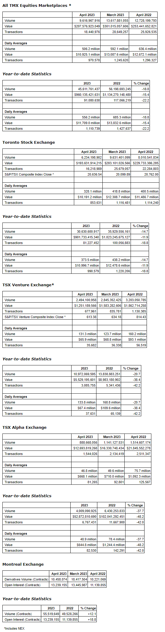 TMX Group Ltd. has released April, 2023, trading statistics for its marketplaces -- Toronto Stock Exchange, TSX Venture Exchange, TSX Alpha Exchange and Montreal Exchange.