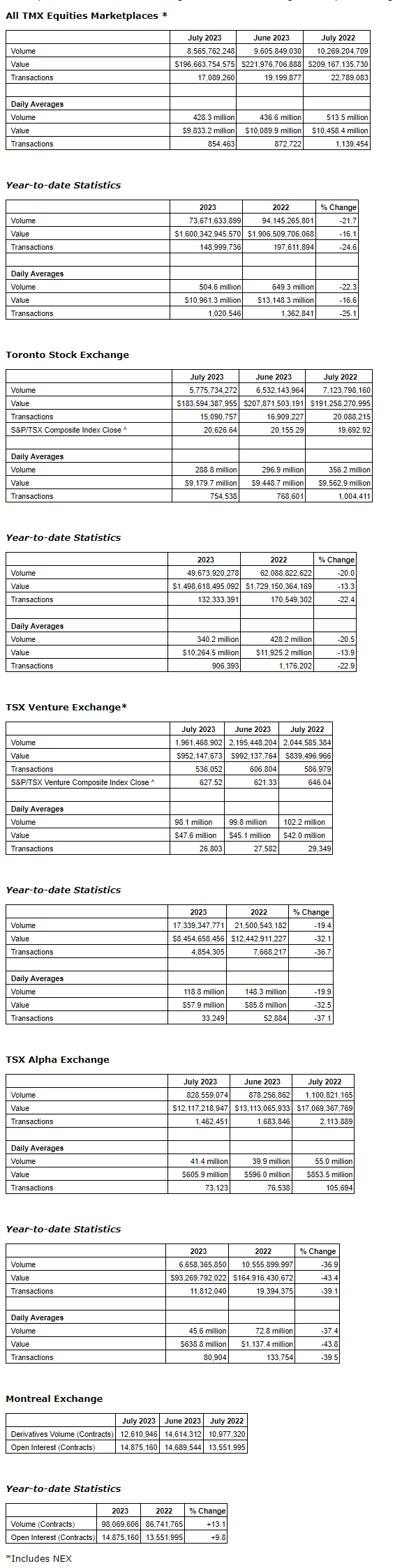 TMX Group Ltd. has released July, 2023, trading statistics for its marketplaces -- Toronto Stock Exchange, TSX Venture Exchange, TSX Alpha Exchange and Montreal Exchange.
