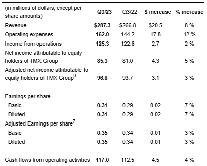 TMX Group Ltd. has released results for the third quarter ended Sept. 30, 2023.