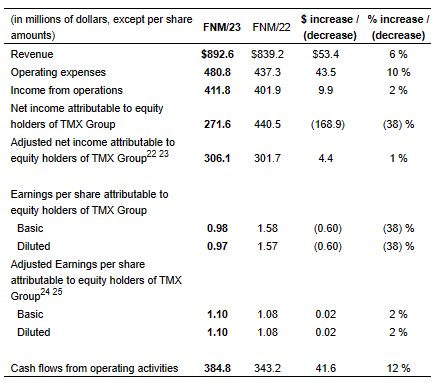 Adjusted net income attributable to equity holders of TMX Group increased by 1 per cent from $301.7-million in FNM/22 to $306.1-million in FNM/23 largely driven by an increase in income from operations and lower net finance costs, partially offset by higher income tax expense.