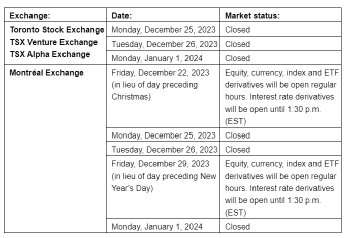 TMX Group Ltd.'s Toronto Stock Exchange, TSX Venture Exchange, TSX Alpha Exchange and Montreal Exchange will be closed on Monday, Dec. 25, 2023, Tuesday, Dec. 26, 2023, and Monday, Jan. 1, 2024, for the Christmas Day, Boxing Day and New Year's Day holidays, respectively.