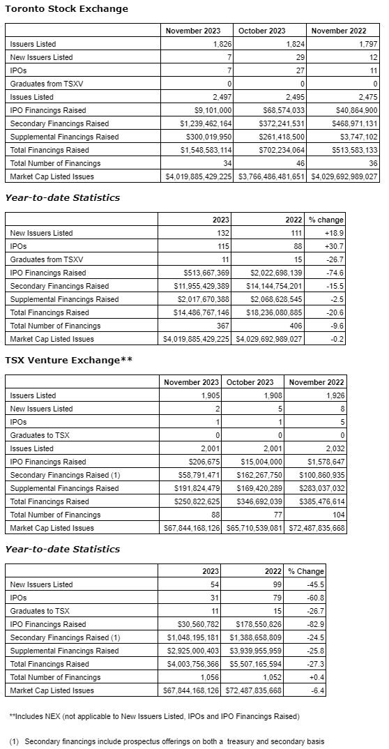 TMX Group Ltd. has released its financing activity on Toronto Stock Exchange and TSX Venture Exchange for November, 2023.