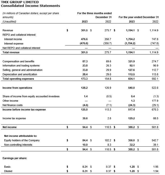 TMX GROUP LIMITED REPORTS RESULTS FOR FOURTH QUARTER OF 2023