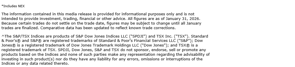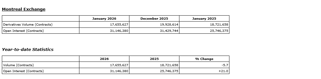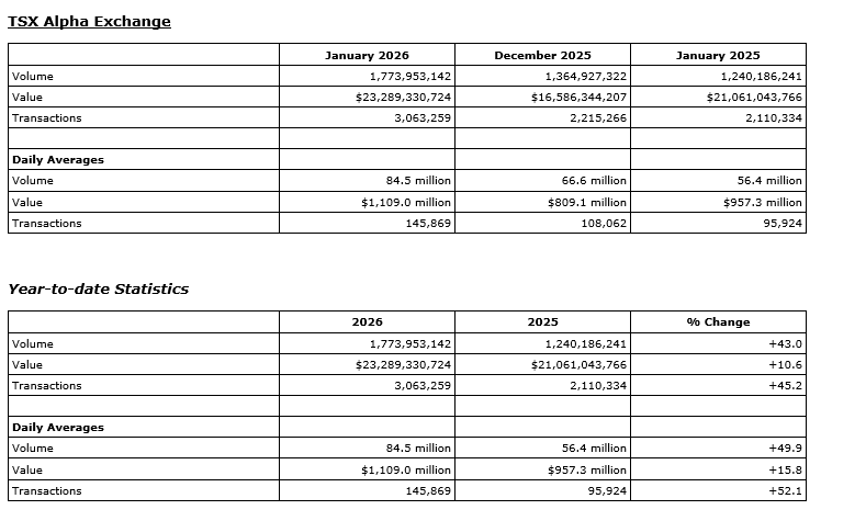 TMX Group Ltd. today released January, 2026, trading statistics for its marketplaces -- the Toronto Stock Exchange, TSX Venture Exchange, TSX Alpha Exchange (Alpha), including Alpha-X and Alpha DRK, and Montreal Exchange (MX).