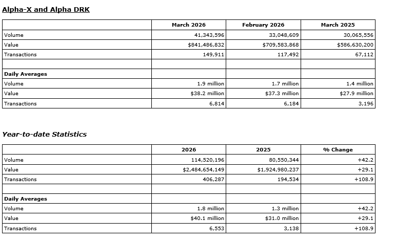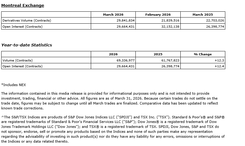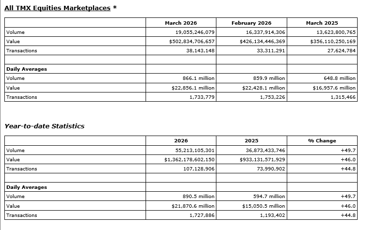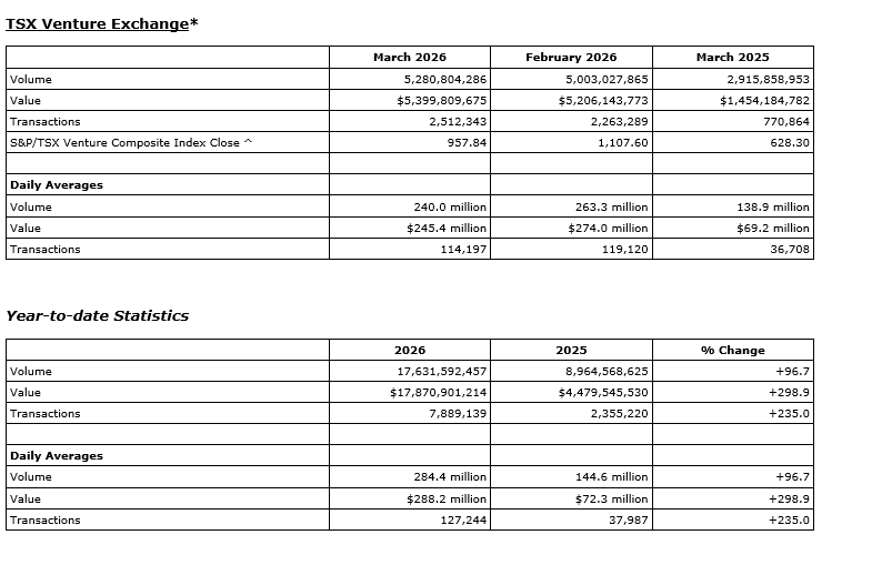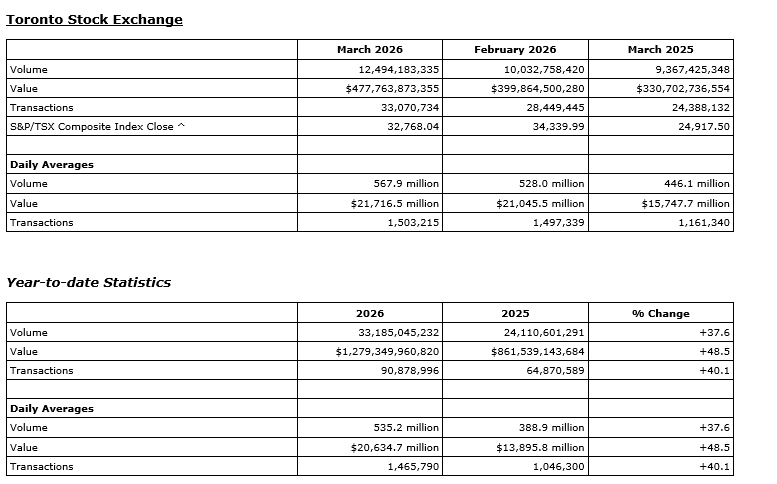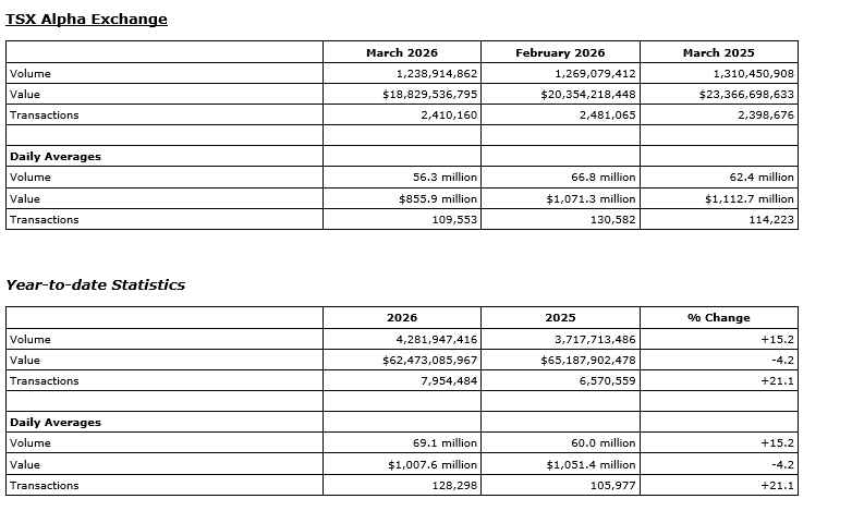 TMX Group Ltd. has released March, 2026, trading statistics for its marketplaces -- the Toronto Stock Exchange, TSX Venture Exchange, TSX Alpha Exchange (Alpha), including Alpha-X and Alpha DRK, and Montreal Exchange (MX).
