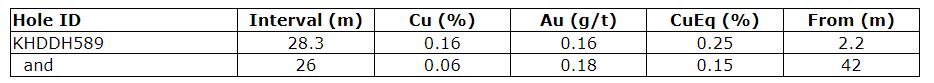 Drilling at cluster two targeted previous shallow porphyry stockwork mineralization and was prioritized given the area is adjacent to existing planned open pits and planned infrastructure. Drill hole KHDDH590 targeted a previous porphyry intercept and encountered a broad zone of low-grade porphyry mineralization with an additional high-grade gold intercept near end of hole (EOH).