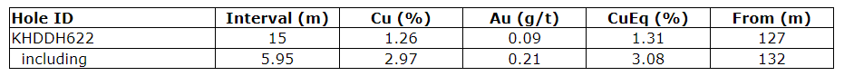 KHDDH622 -- 15 m at 1.26 per cent Cu from 127 m;