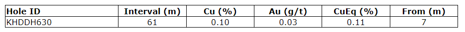 Drill hole KHDDH630 also targets surface copper anomalism and has returned a broad interval of low-grade copper porphyry mineralization. This drilling all points to cluster three having the potential for a large-scale shallow copper porphyry with a high-grade core. Additional drilling is being planned to follow up on these results.