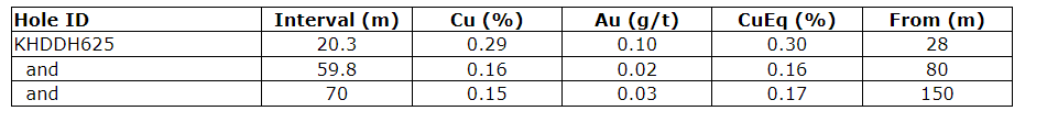 Drill hole KHDDH625 targeted surface copper in the south of cluster three. This hole encountered several broad zones of low-grade porphyry mineralization and a shallower moderate-grade intercept.