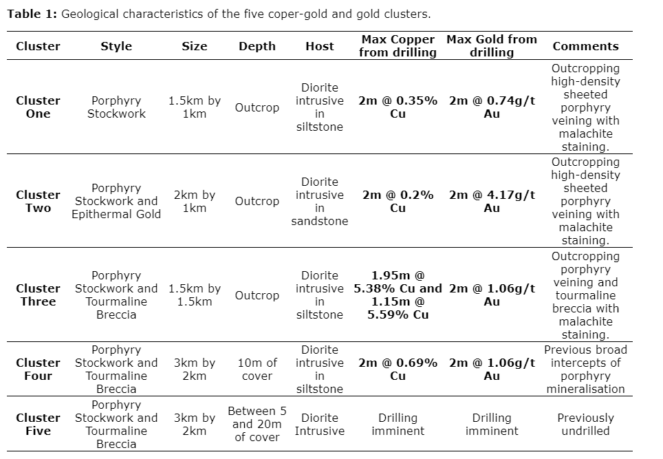 New shallow discovery drilling intersects both high-density stockwork, breccia mineralization and gold-only mineralization across three largely unexplored porphyry clusters.