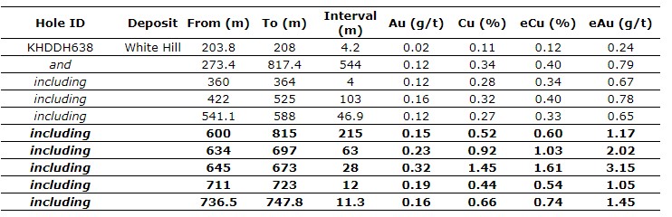 KHDDH638 -- 544 m at 0.4 per cent copper equivalent (CuEq) (0.34 per cent Cu and 0.12 g/t Au) from 273.4 m: